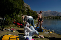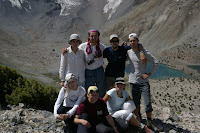 ia pat, bet mums bandant prie jo artėti, jis, bjaurybė, tolsta. Jau ir nusibodo, ir devintas prakaitas išmušė, kol galiausiai nusileidom. Čia mus pasitinka arbata, sausainiai – vietinis svetingas tadžikas mums pasiūlo gėrybių iš savo „kiosko“. Įsikuriam paėjėję tolėliau ežero krantu.