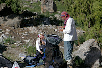 padalijome saldainius ir toliau mėgaujamės gaiviu pavėsiu. Ten pat įsitaiso ir vienas vairuotojas, kuris įrodo, jog iki Marguzoro ežerų eiti neverta – nieko ypatingai gražaus, o kelio minimaliai dviem, trim dienoms. Taip kad nusprendžiame eiti link Didžiojo Alo ežero. Tačiau kelios kuprinės sunkios, todėl einame pakankamai lėtai. Nakvynei apsistojome netoliese Razmyč kišlako, pas vieną,